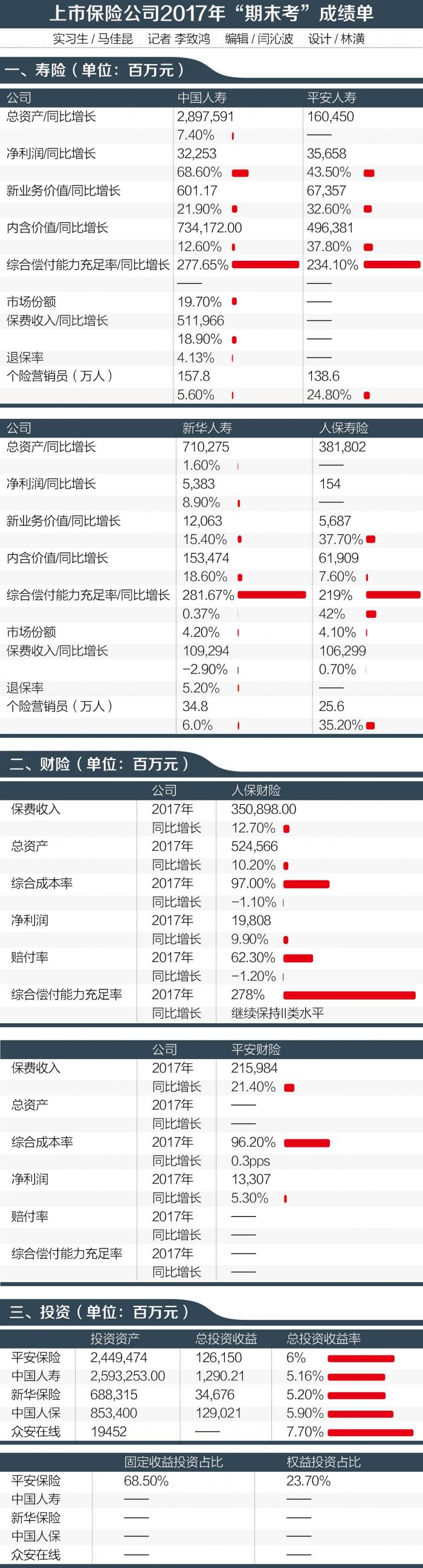 上市保险公司2017年年报披露进入尾声,截至3月26日,众安在线、中国平安、新华保险、中国人寿、中国太平、中国人保、人保财险(以披露时间为序)相继交出答卷。