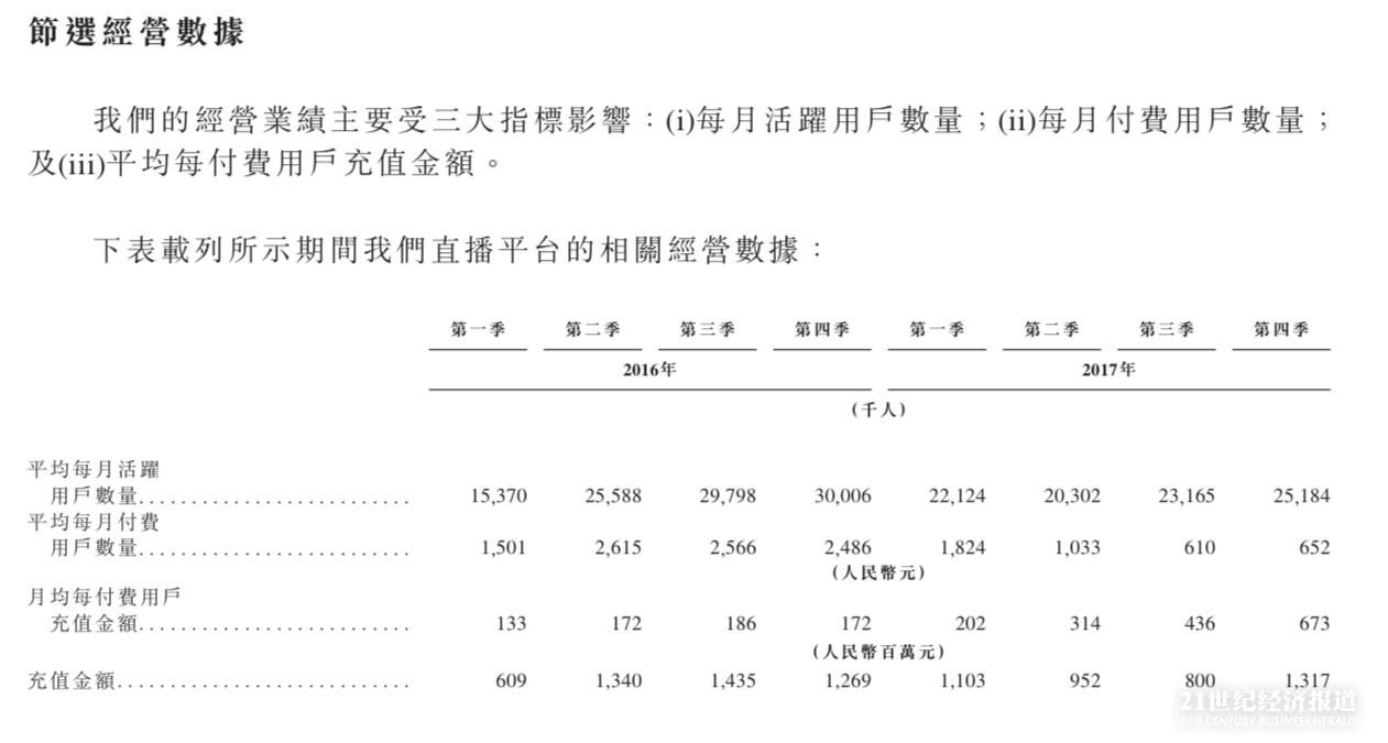 此外,招股书显示,映客直播业务在2017年较2016年活跃用户有所下降,2017年四季度为2518.4万人次,低于2016年四季度的3000.6万人次,除了2017年一季度较2016年一季度活跃用户数量高外,其余三个季度君明显低于2016年的水平。