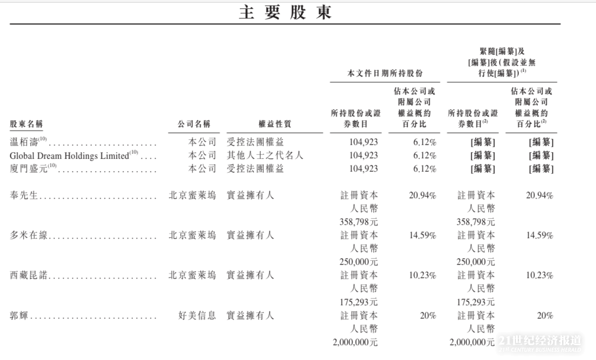 招股书披露的主要股东中,映客创始人奉佑生持股20.94%,多米在线持股为14.59%、昆仑万维透过全资子公司西藏昆诺持有比例为10.23%、郭辉持股为7.29%。