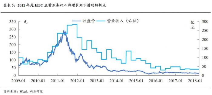 2011年是HTC由辉煌转向没落的转折点。2011年以前的HTC创下了智能手机史上的多个第一:推出第一款Windows智能手机、第一款Android手机、第一款4G手机等,一举成为安卓智能手机的领先者。根据Gartner公布数据显示:2010年HTC的智能手机出货量为2460万部,占全球智能手机出货总量的1/12左右。2011年,HTC所占份额攀升至9.1%,销售量达到了约4300万部,2011年4月HTC的市值更是首次超过诺基亚、暴增至335亿美元,成为仅次于苹果的第二大手机厂商。而2012年开始,HTC智能手机销量下滑到3210万部,市场份额仅占4.7%;2013 Q1市场份额再度下降到2.5%,而2013Q2已经跌出全球十大智能手机排行版。在主营业务收入方面,2012年开始HTC销售收入逐年接连缩水,2017年前三季度主营业务收入仅101.6亿元,占巅峰时期2011年营收的比重不到1/7,反映在资本市场上,HTC的总市值从2011年的巅峰时期以来缩水了近90%。