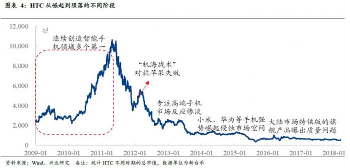 2011年,HTC被苹果以专利侵权诉诸公堂,而后被美国实施进口限制;2012年HTC的旗舰产品出现质量问题,被同年推出的三星S3和苹果4S远远甩在身后;2013年HTC开始专注于高端机市场,一年仅推出一款M7而市场并不买账;到了2015年大陆市场的小米、华为、OPPO已相继强势崛起,牢牢占据中低端市场,甚至逐步蚕食高端市场份额,HTC被彻底甩出全球前十手机品牌商的阵营。