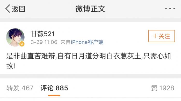 孙宏斌对投资乐视系的态度转变,也迎来了贾跃亭妻子甘薇的疑似回应。在微博中,甘薇写道:“是非曲直苦难辩,自有日月道分明,白衣惹灰土,只需心如故! ”