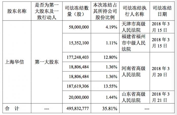 华信国际称,上海华信持有公司股份1384501534股,全部为无限售流通股,占公司总股本的60.78%。截至本公告日,上海华信所持股份累计被司法冻结495832777股,占其所持公司股份总数的35.81%,占公司总股本的21.77%。