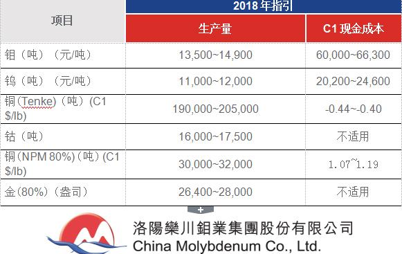 2018年洛阳钼业主要产品产量及现金成本指引如下: