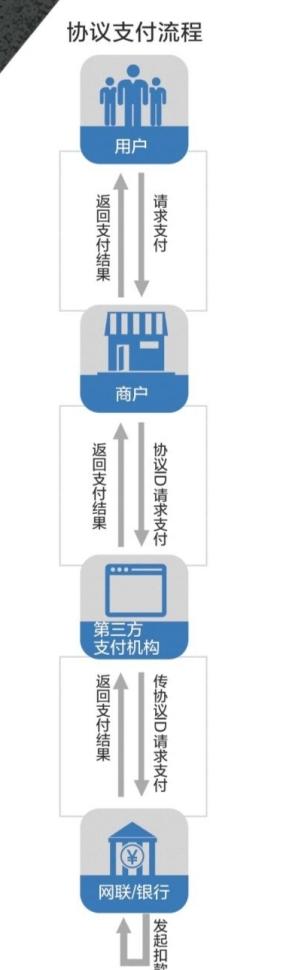 所谓协议支付,是指客户通过与银行签订协议,将客户银行账户与商户关联账户进行绑定,付款时可直接输入商户关联账户的支付密码即可完成付款。区别于代扣,协议支付强调用户需要签约并完成绑卡授权,以及在支付中也需要用户授权,第三方支付机构才有权利通过网联(银联)将用户在银行卡中的钱划走。