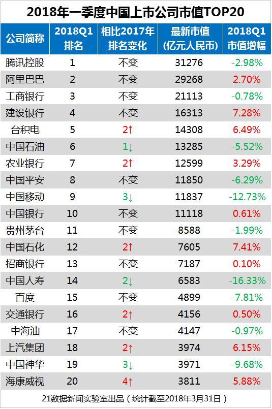 2018年一季度资本市场跌宕起伏,风云变幻。期间,腾讯遭遇上市以来的首次大股东套现,更有多只白马股杀跌。如此境况下,中国上市公司的市值排名也出现了重大变化。