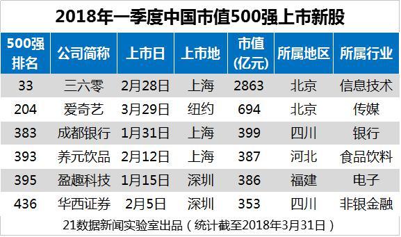 6家公司通过IPO或借壳上市新晋500强,分别是周鸿祎的三六零、刚在纳斯达克挂牌上市的爱奇艺、创造新股“最少涨停”尴尬纪录的养元饮品,以及盈趣科技,和成都银行、华西证券两家四川金融公司。