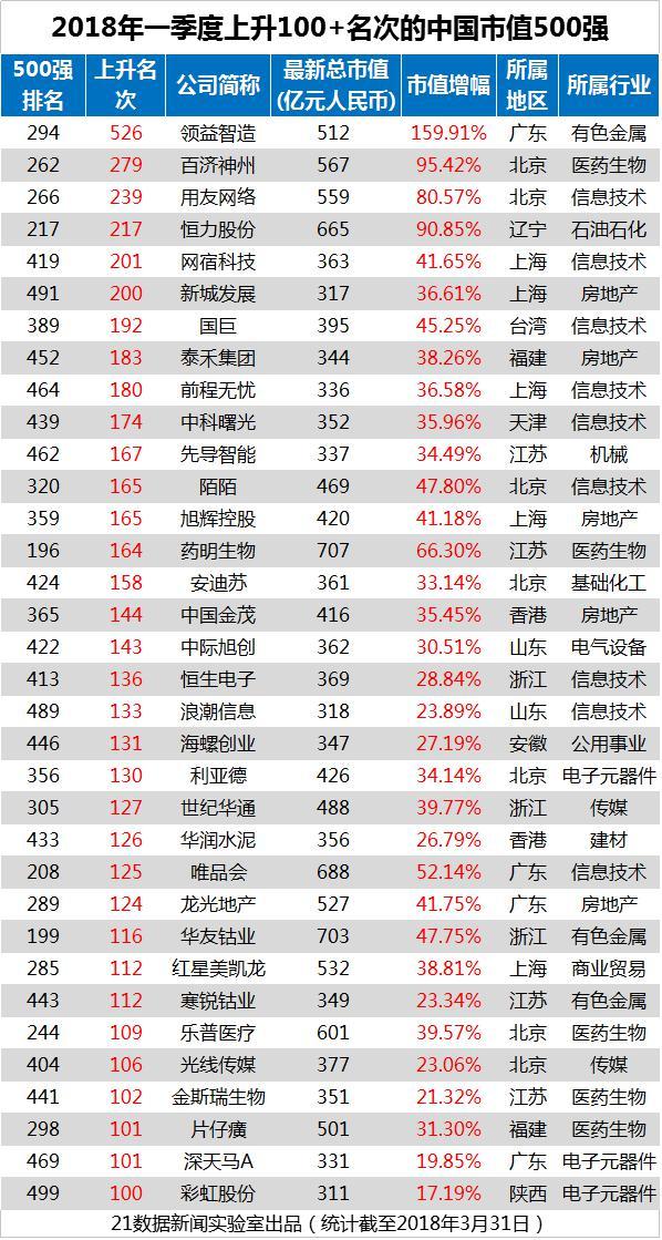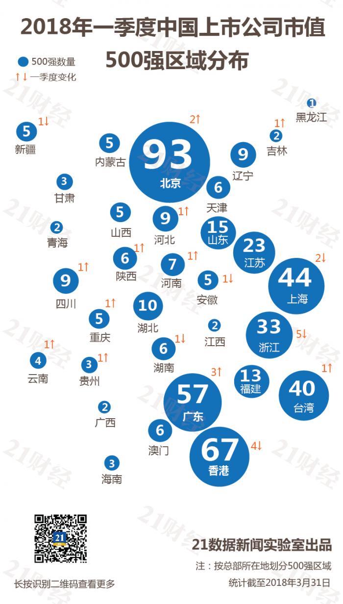 21数据新闻实验室选择在上海、深圳、香港、纽约等全球15个交易所上市的6781家中国公司,对其2018年一季度末市值进行加总换汇计算,重磅推出“2018一季度中国上市公司市值500强榜单”!(点击查询>>>你们那有多少家?)