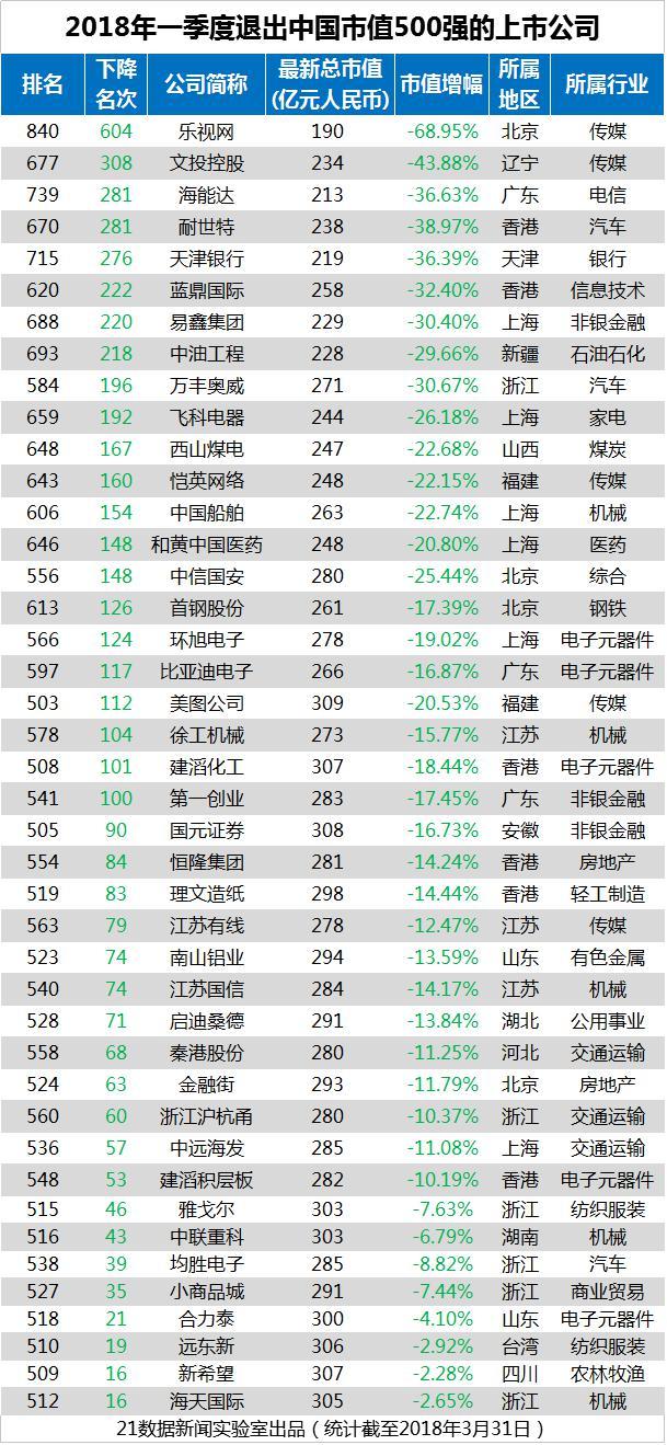 与此同时,42家公司退出500强,以乐视网最为悲催。据21数据新闻实验室统计,目前乐视网190亿的总市值在中国上市公司中排名第840位,相较去年底第236名的成绩大幅下降了604个名次。