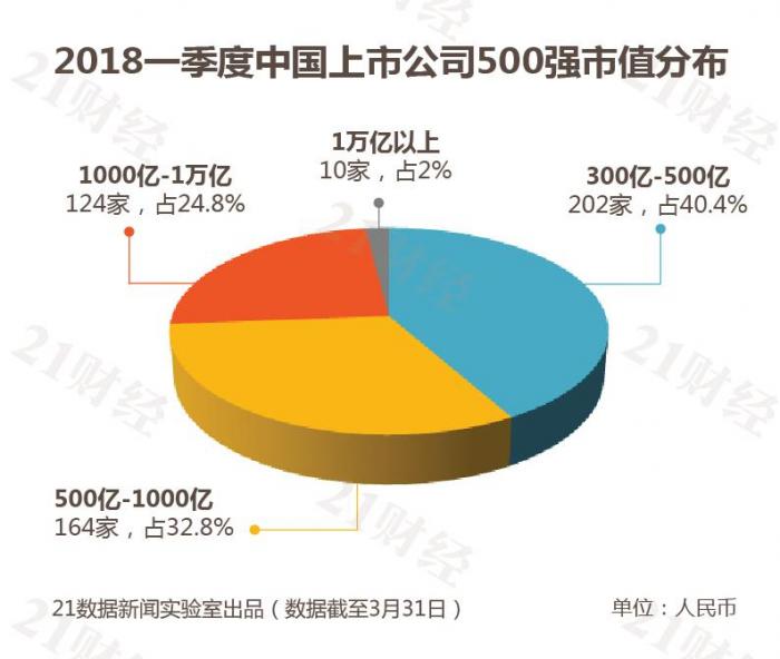 统计显示,截至2018年一季度末,中国上市公司一共有6781家,总市值合计达97.06万亿元,其中500强市值合计62.67万亿元,与目前A股市值相当,对整体上市公司的市值贡献比为64.57%。