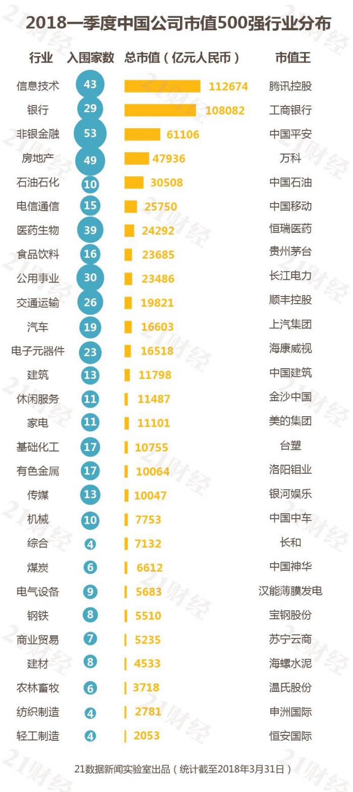 信息技术(11.27万亿)、银行业(10.81万亿)依然为500强的市值担当。