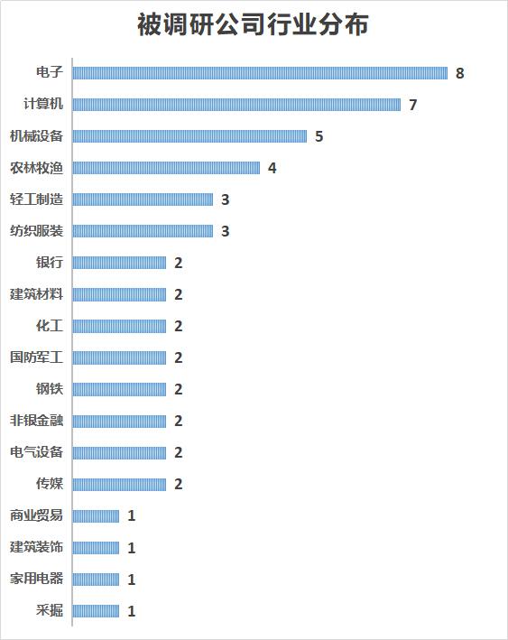 从行业来看,电子行业最受机构青睐,相关调研公司有8家;其次是计算机行业,有7家公司被调研。