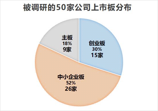 统计显示,被机构调研的这50家公司中,属于中小板的有26家,属于创业板的有15家,另外9家来自主板。可以看到,中小创仍是机构调研的主要对象,占比超8成。