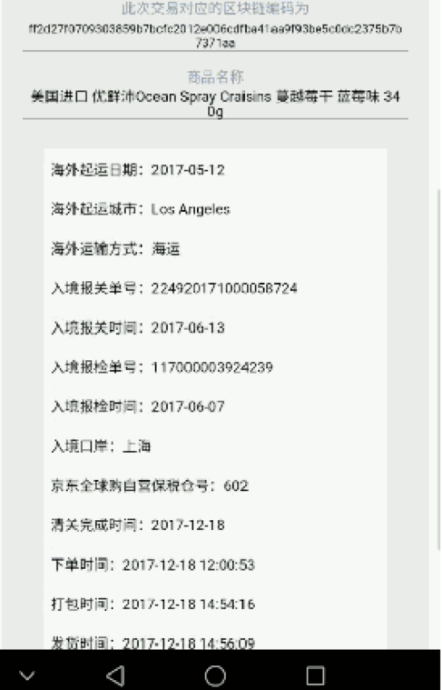 在利用区块链技术溯源的同时,京东全球购还接入国家质量监督检验检疫总局的商品溯源系统。凡是进入宁波、天津以及广州的京东保税仓的商品,均需经过严格检验并粘贴国家质量监督检验检疫总局印制的溯源码。商品送达后,用户只需手机扫描一下溯源码,便可知道该商品的生产工厂、质量信息、物流信息和监管信息等。