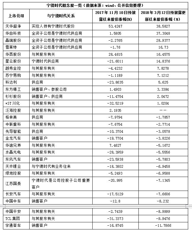 涨幅最高的天华超净与宁德时代存在一定股权关系,其控股股东、实际控制人裴振华持有宁波联合创新新能源投资管理合伙企业(有限合伙)79.91%股份,而联合创新持有宁德时代8.50%的股份。