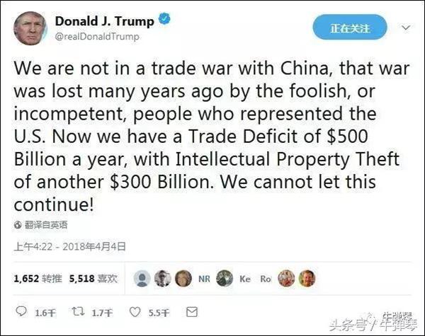 以至于特朗普当天也发表推特说:我们没有与中国进行贸易战,战争在多年前就被那些愚蠢无能的代表美国的政客输掉了……我们不能让这样的情况延续!