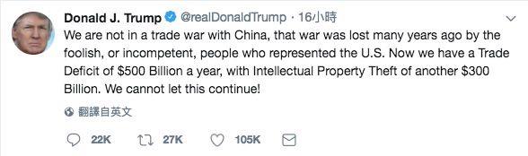松口的还包括特朗普。在中国商务部4月4日发布反制关税清单后不久,特朗普发布推特称,“我们没有和中国打贸易战,这场战争多年前就被当时代表美国的那些愚蠢无能的人打输了。现在我们一年有5000亿美元的贸易逆差,另有3000亿美元知识产权被窃。我们不能让这一切继续!”
