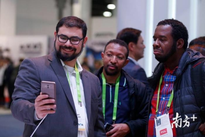 2018年1月9日,观众在美国拉斯维加斯消费电子展华为展台试用Mate 10 Pro手机。新华社记者李颖摄