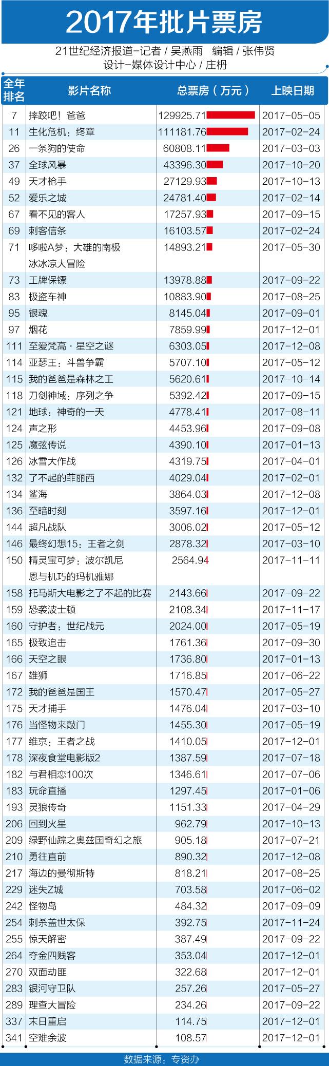 据21世纪经济报道记者粗略统计,2017年全年共有89部进口片上映,总票房259.6亿元;其中,批片55个,总票房57.6亿元。进口片数据在2014—2016年均为40部上下,分账片份额并未改变,这里增加的便是批片。而行业内一直传言的配额全面放开,则给了批片最大的想象空间。
