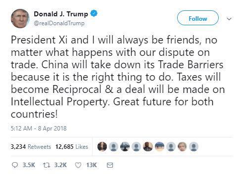 特朗普总统北京时间8日晚上在最新发出的推特中表示:“习近平主席和我将永远是朋友,无论我们的贸易争端如何。中国将取消贸易壁垒,因为这是正确的做法。税收将会变成互惠的,中美将会在知识产权上达成协议。两国都会有伟大未来!”