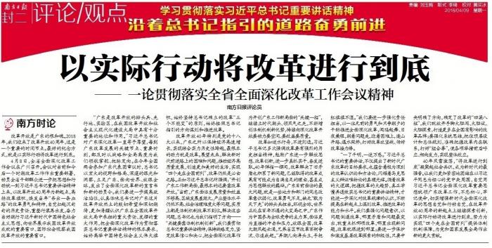 4月8日,全省全面深化改革工作会议在广州召开。南方日报紧紧围绕这一主题,充分发挥南方评论高地优势,连续刊发三篇系列评论员文章,聚焦广东新时代全面深化改革,号召以改革开放40周年为新起点,焕发当年“杀出一条血路”的改革勇气和精神,重整行装再出发,奋力当好践行习近平新时代中国特色社会主义思想,向世界展示我国改革开放成就的重要窗口、国际社会观察我国改革开放的重要窗口。