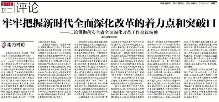 4月10日刊发的《牢牢把握新时代全面深化改革的着力点和突破口》,紧扣“四个走在全国前列”新要求,对广东新时代改革的重大任务、主攻方向、重要抓手进行抽丝剥茧式深入分析,讲清楚、说明白广东接下来的改革究竟该怎么发力。文章指出,要聚焦体制机制创新,抓住牵一发而动全身的重大改革,在推动经济高质量发展、转变政府职能、形成全面开放新格局、推动城乡区域协调发展、营造共建共治共享社会治理格局等方面推出精准有力、务实管用的举措,奋力开创广东深化改革发展新局面。