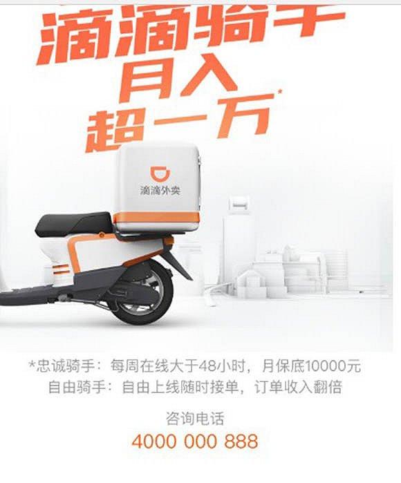 在滴滴外卖官方招聘平台上有两种模式供骑手选择:忠诚骑手和自由骑手,即全职和兼职。滴滴以“月入1万”的广告语来吸引其他平台骑手加入。