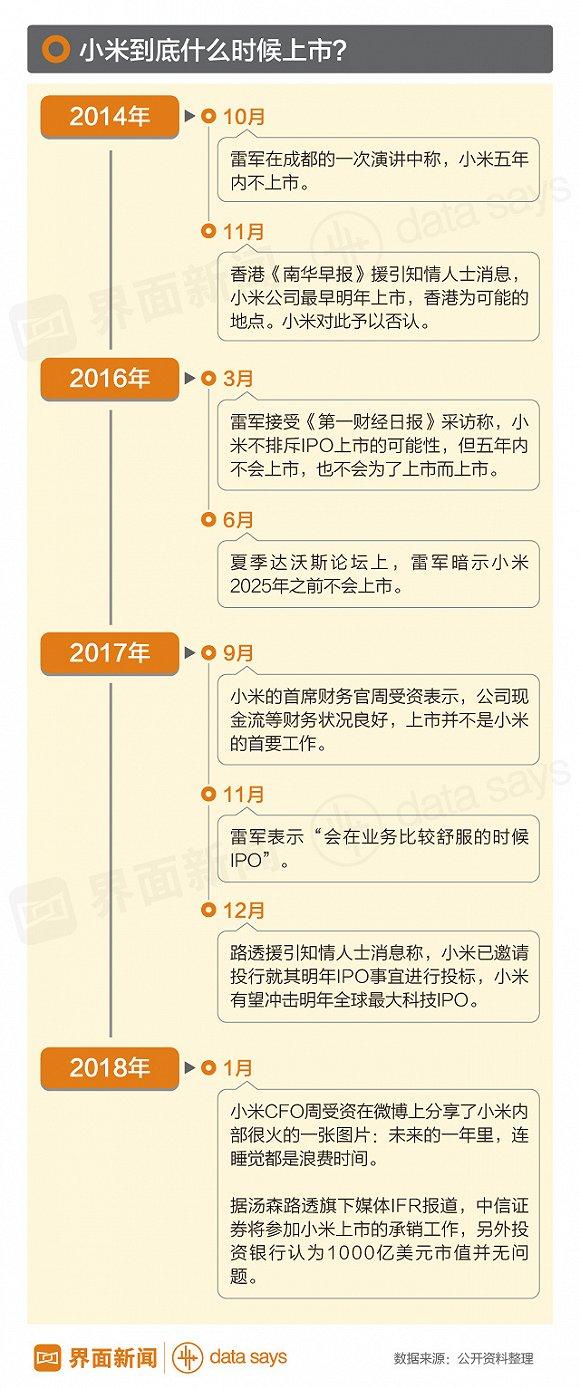今年1月,小米CFO周受资在微博上分享了一张图片,并点赞了网友“这是在为上市做准备吗”的评论,这被外界解读为是对小米2018年IPO计划的默认。