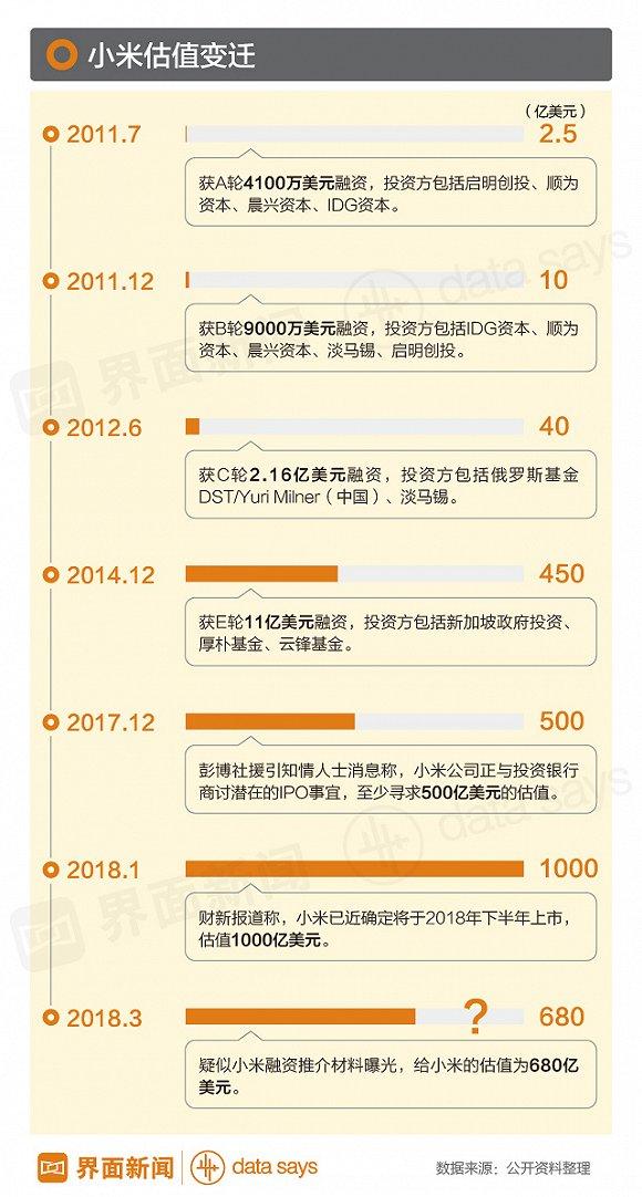 不过,3月份曝光的融资材料给小米的估值仅为680亿美元。假设小米于2018年第四季度上市,其市值将会介于854亿至1351亿美元之间。
