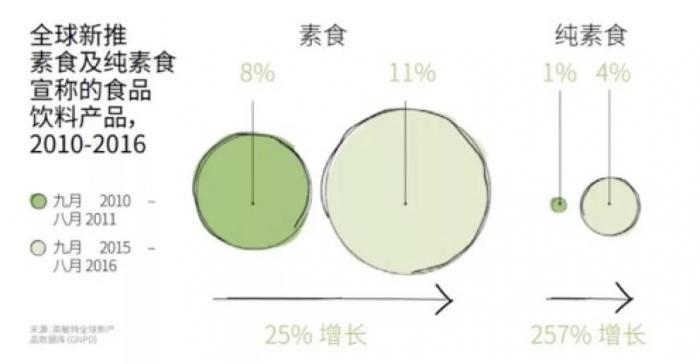 市场研究咨询公司英敏特(Mintel)发布的《2017年全球食品与饮料趋势》报告也指出: 2015年9月-2016年8月,打着“素食”和“纯素食”概念的产品数量,比五年前各自增加了25%和257%。