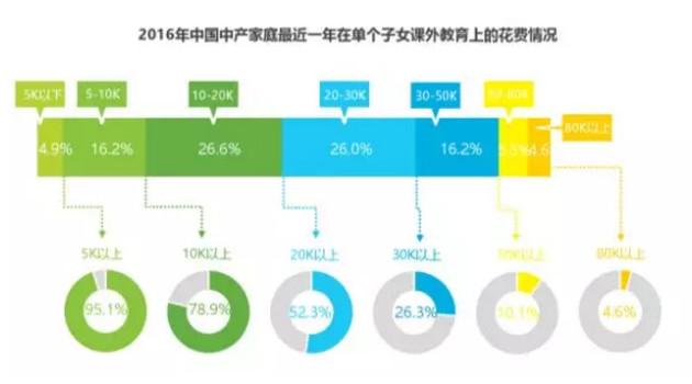 据《2017年中国中产阶级家庭教育观念白皮书》,在2016年78.9%的家庭在课外教育投入超过了10000元,超过一半的家庭在课外教育的年消费超过了20000元。