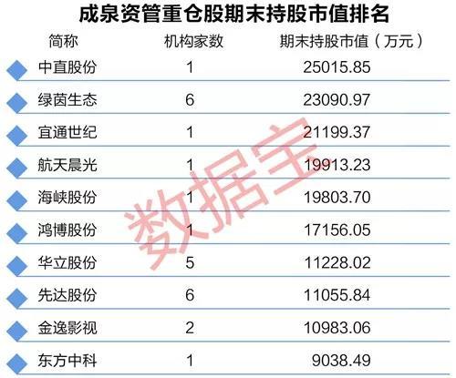从持股市值角度看,成泉资管持有9只股票2017年末持股市值超过亿元。其中,成泉汇涌八期去年四季度新进中直股份537.63万股,期末持股市值2.5亿元位居首位;成泉汇涌八期、成泉汇涌一期等6只成泉资管旗下产品持有绿茵生态301.53万股,期末持股市值达2.3亿元位居次席;成泉汇涌八期新进宜通世纪1829万股,期末持股市值2.1亿元位居第三位。此外,成泉资管持有航天晨光、海峡股份、鸿博股份等6股期末持股市值均超过亿元。其中,航天晨光、鸿博股份、金逸影视等个股为新进重仓股。