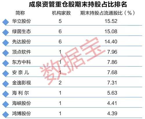 从持股占流通股比例来看,成泉资管持有华立股份、绿茵生态、先达股份等3股占流通股比均超过10%。其中,成泉汇涌一期、成泉汇涌三期等5只成泉资管旗下产品持有259万股华立股份,占流通股比例达15.52%位居首位。
