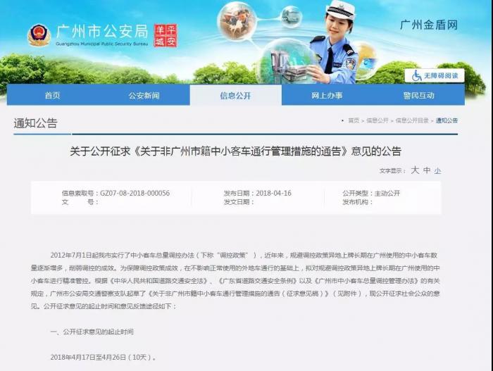 目前,非广州市籍中小客车通行管理措施的通告文件正在广州市公安局门户网站广州金盾网挂网征求民意。