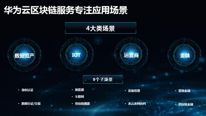 目前,华为云区块链服务主要专注4大类9小类应用场景,包括数据资产、IOT、运营商和金融领域等,如:身份认证、数据存证/交易,新能源、公益捐赠、普惠金融等。