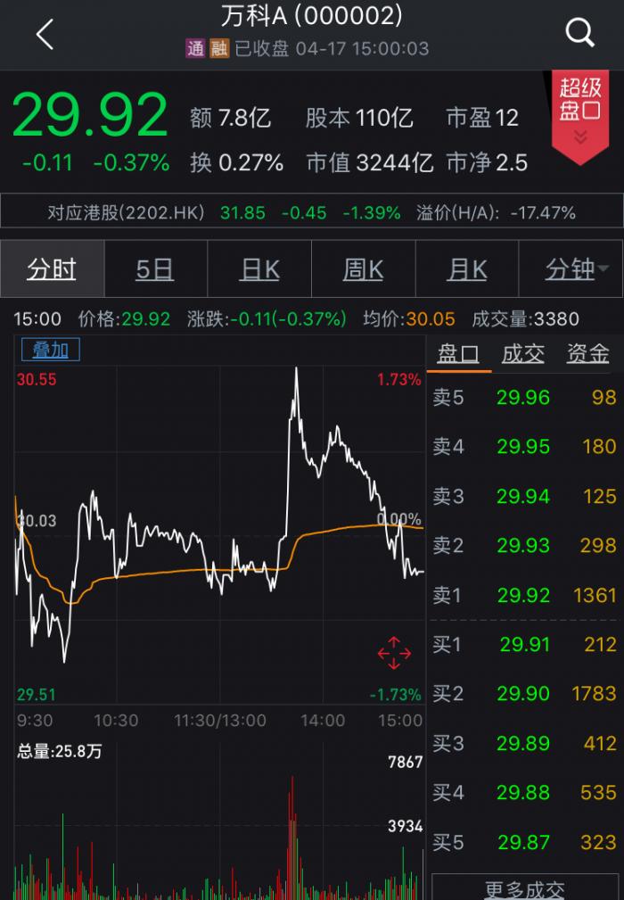4月17日,万科A报收29.92元/股,跌幅0.37%,全天成交额7.76亿元。