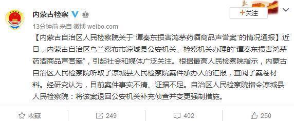 “内蒙古检察”微信公号消息,近日,内蒙古自治区乌兰察布市凉城县公安机关、检察机关办理的“谭秦东损害鸿茅药酒商品声誉案”,引起社会和媒体广泛关注。根据最高人民检察院指示,内蒙古自治区人民检察院听取了凉城县人民检察院案件承办人的汇报,查阅了案卷材料。经研究认为,目前案件事实不清、证据不足。自治区人民检察院指令凉城县人民检察院:将该案退回公安机关补充侦查并变更强制措施。