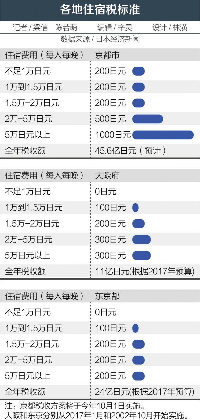 21世纪经济报道记者了解到,2002年,东京最早开征住宿税,大阪从去年开始征收住宿税。东京的标准是每晚住宿费超过1万日元的房客收取100日元,超过1.5万日元收税200日元。仅此一项,东京都财政每年即可增收超过20亿日元。据日本政府表示,这些税收都用在了旅游宣传、导游培训及旅馆的无障碍改造等方面。