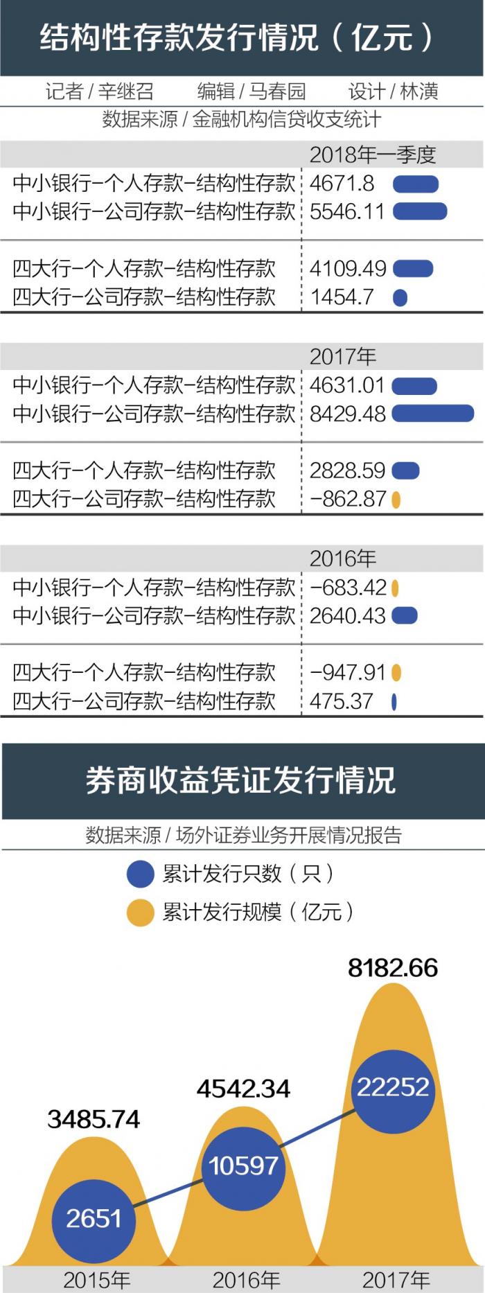 资管新规静待落地,保本理财产品渐告消失;结构性存款、券商收益凭证开始受追捧。二者被视为“保本保息”的替代渠道,实际上均非理财产品,而是各自机构凭借信用发行的一种负债产品。