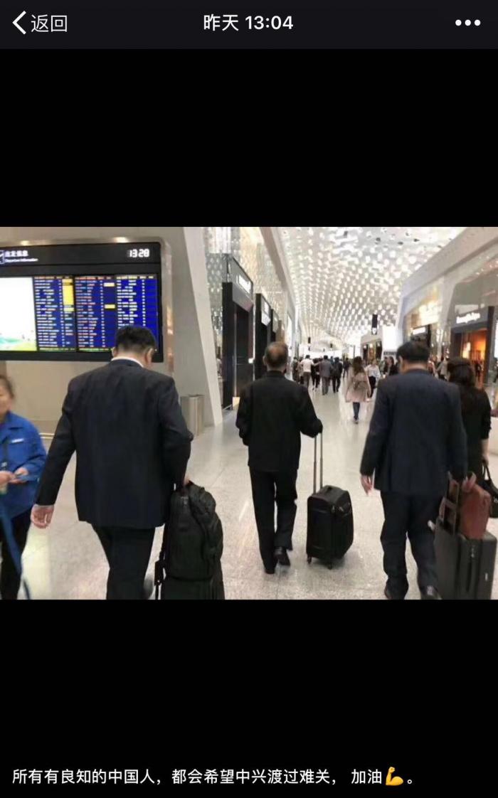 中兴方面对此并未回应。从照片中的机场显示屏信息来看,当时时间为“13:28”,由于21世纪经济报道记者在4月18日午间已经在朋友圈看到这张照片,据推测,拍摄时间应该为4月17日中午。从背影推测,从左到右三者依次为中兴通讯董事长殷一民、中兴通讯创始人侯为贵、中兴通讯总裁赵先明。他们的目的地当前尚不知晓。