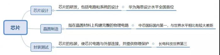 据新时代证券研报,IC设计方面,华为海思设计水平位于全国首位,全球前十;IC制造方面,中芯国际集成电路的制造工艺在国内处于第一位,与世界水平相比还有比较大的差距;IC封装方面,长电科技在收购星科金朋后,封装测试能力总规模位列世界前三。