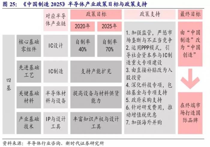 目前我国对半导体产业的政策支持文件有:《国家集成电路产业发展推进纲要》及《中国制造2025》。《国家集成电路产业发展推进纲要》给予了IC产业相应的政策支持、财税优惠, 设立了大基金。 《中国制造2025》强调,最终在市场终端打造集IC设计、IC制造、半导体材料与设备、IP 与设计工具四者为一体的国际综合品牌的目标。 其中“加强海外并购”被纳入政府政策支持项目。