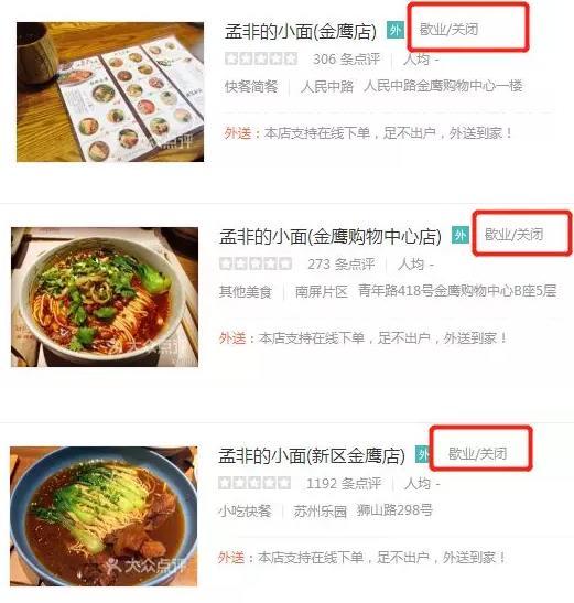 △孟非的小面苏州店、昆明店、南通店均已关闭