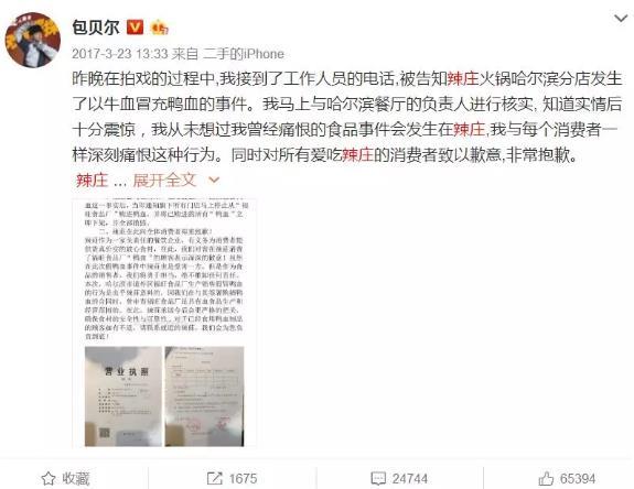 如去年3月份,明星包贝尔旗下的辣庄火锅店哈尔滨分店,就曾出现过牛血假代鸭血的负面事件,虽然包贝尔事后在微博上向广大消费者道歉,但网友并不买账,认为包贝尔及其餐饮公司在推卸责任。