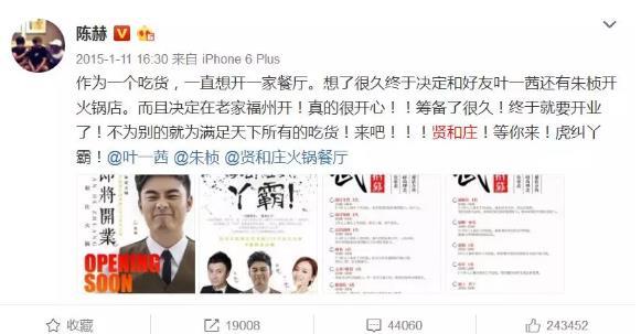 △明星陈赫为自己的火锅店打广告的微博得到24万个赞