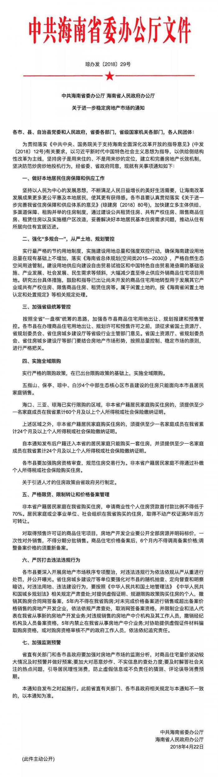 昨日(4月22日)晚间,中共海南省委办公厅、海南省人民政府办公厅发布了《关于进一步稳定房地产市场的通知》(下称《通知》)。《通知》在土地供应层面、购房资格、住房贷款、房屋销售等各个方面都有具体要求。本通知自发布之时起施行。