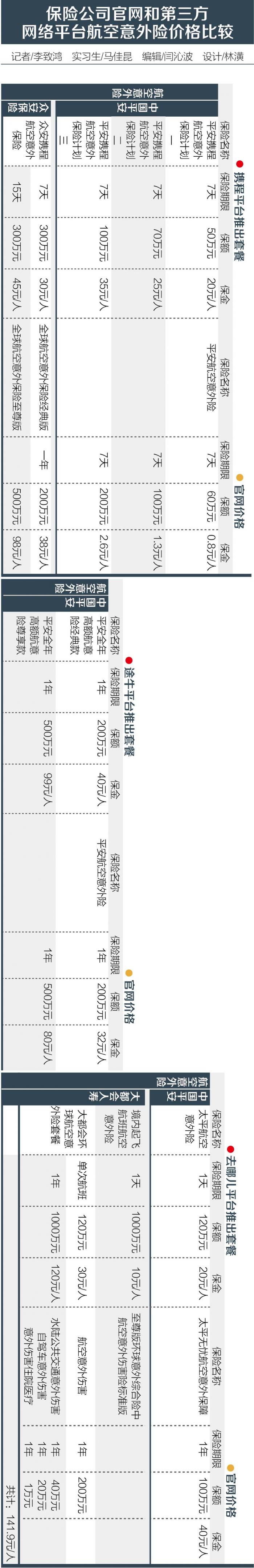 根据21世纪经济报道记者统计,携程、去哪儿、途牛、同程旅游、驴妈妈旅行、飞猪等第三方网络订票平台在出售航空机票的同时,推出了相应的航空意外险套餐,在保障内容大体相同的情况下,部分价格明显高于保险公司官网。