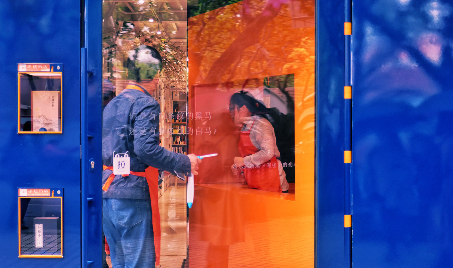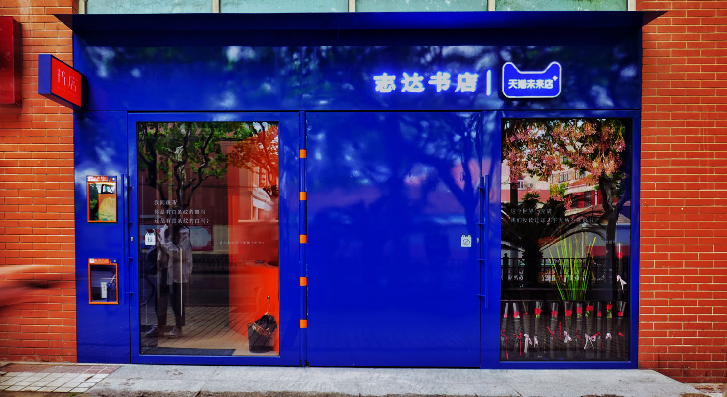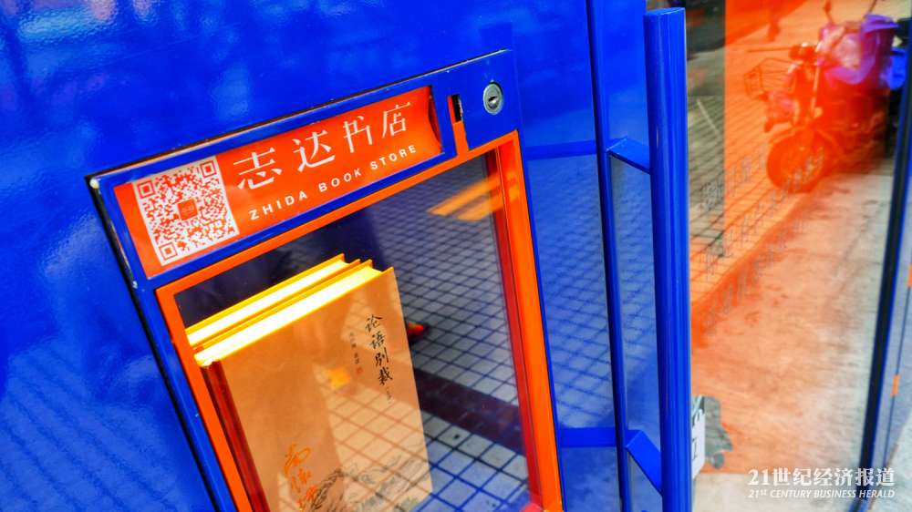 展示门面的书籍并有二维码标识供路人关注该书店的APP。