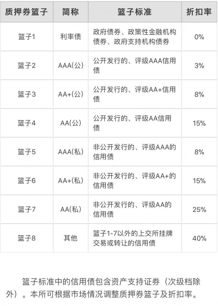 从内容上看,业务开展初期,三方回购的正回购方限于经有关金融监管部门批准设立的金融机构;公募证券投资基金和商业银行的理财产品。而担保品方面,则按债券类型、发行方式和债券评级划分为8个质押券篮子。具体划分标准及折扣率如下: