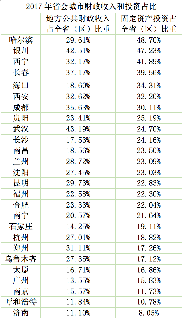 从2017年的情况看,武汉、银川、长春、成都、西安、西宁、郑州的地方财政收入占全省比重(即当地一般预算收入占全省比重)为30-50%;从省会城市的投资额占全省比重来看,2017年银川、长春、成都、西安、西宁、哈尔滨、海口为30-50%。